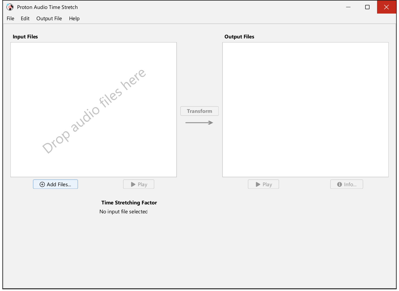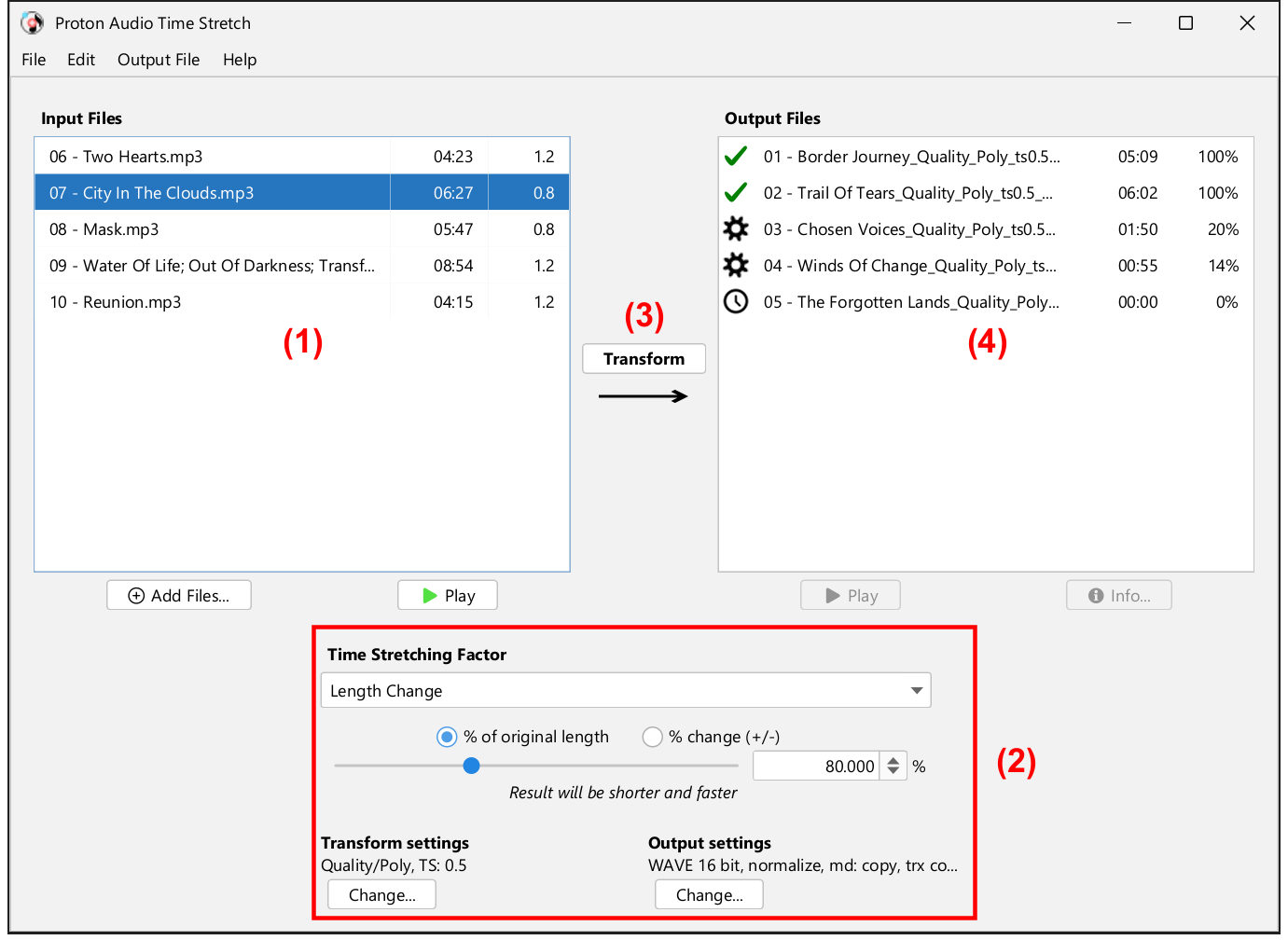 Note: The input files are never deleted or modified: the application transforms them into new audio files. The transformed files have the same name, but with a suffix appended to the file name. The suffix corresponds to the time stretching ratio.