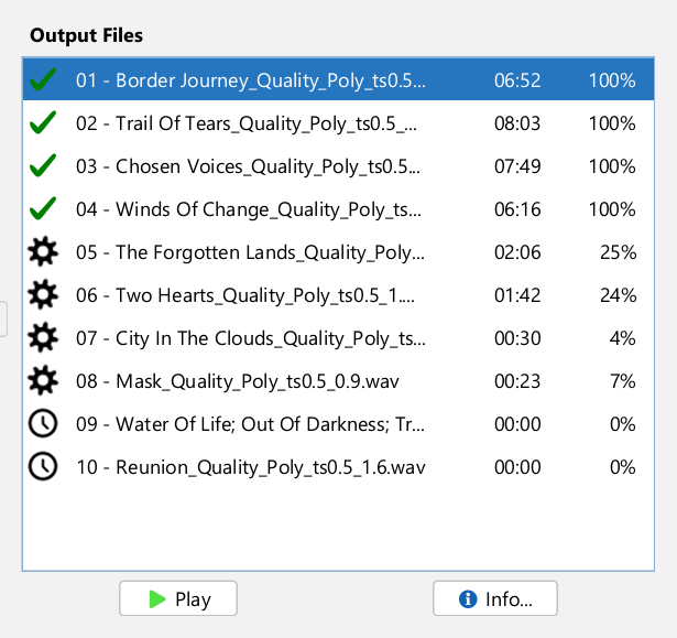 Once you have set the time stretching factor, click the button to start transforming the selected file(s). The selected files will disappear from the "Input Files" list, and appear on the "Output Files" list illustrated on the following figure. A rotating throbber (
