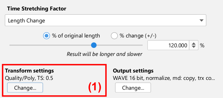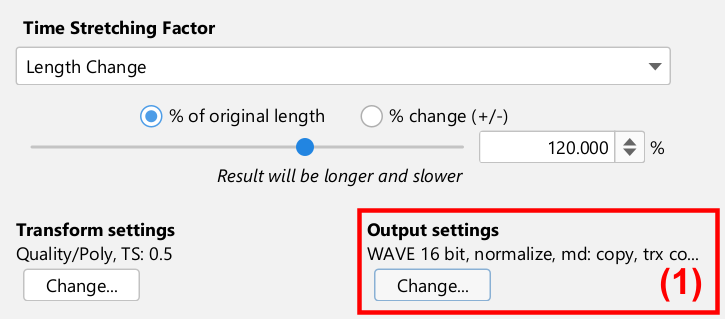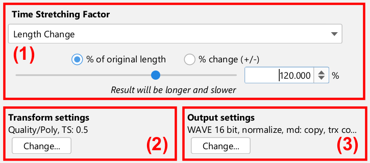The next sections discuss the three parts in more details: Time Stretching Factor, Transform Settings and Output Settings.