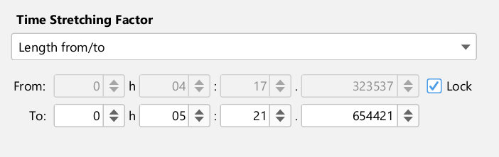 Specify the length of the input file and the length of the transformed file. Both values are specified as a number of audio frames. By default, the length of the input file is set to the length of the selected input file(s) and cannot be modified. By unchecking the "" check box, you can specify a fictive input file length. In all case, the ratio between the specified lengths is used as the time stretching factor.