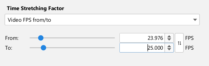 For example, a typical NTSC to PAL conversion plays a video track originally at 23.976* FPS (NTSC) on a 25 FPS system (PAL). In that case, to stretch the audio accordingly, enter 23.976 in the "From:" field, and 25 in the "To:" field.