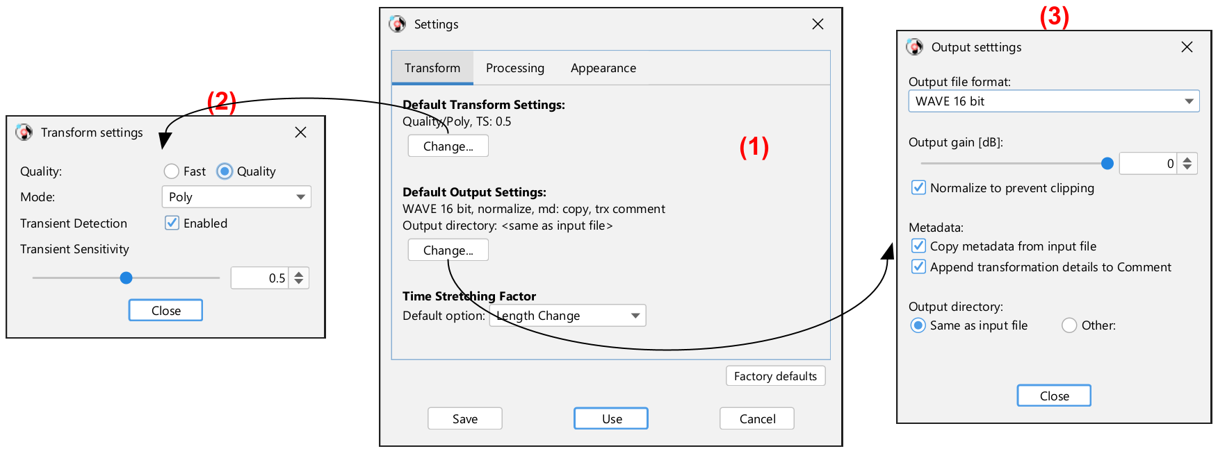 Clicking on the button under Default Output Settings opens the panel shown on the right (3) to change the default values for the output settings (discussed in section 3.2.3).