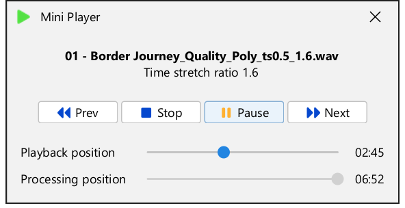 The Mini Player on the other hand can play an output file as soon as its transformation has started, even if it has not finished yet. It will play as much audio as has been already transformed.