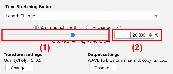 You can either move the slider (1), or type a value (in percent) in the number field (2). A value of 120% for example will make the audio file 20% longer. A value of 80% will make it 20% shorter. Note however that nothing is done until you click on the button.