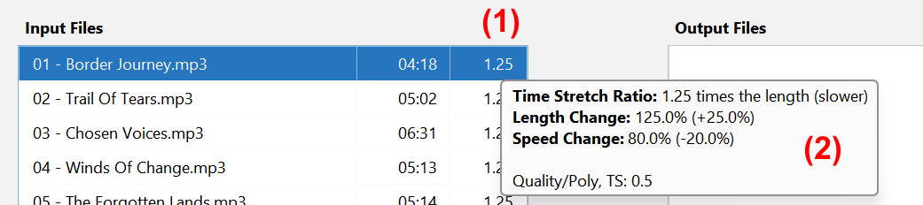 For each file, the chosen time stretching factor appears on the "Input Files" list, on the third column (1) of the figure below. The value here is always displayed as a ratio between the output length and the input length (such as "2.0" for two times longer). The value that is displayed might be rounded, but internally the exact value is remembered and used. By moving the mouse over it and waiting a few seconds, a tooltip appears (2) and displays the exact value (as a ratio), as well as the value as a Length Change and as a Speed Change.