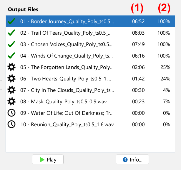 When you click on the button, the files appear immediately in the "Output Files" panel, but the transformation has just started, and may not have finished yet. However, it is possible to play the resulting output file before it has been fully transformed: only the audio processed so far can be played.