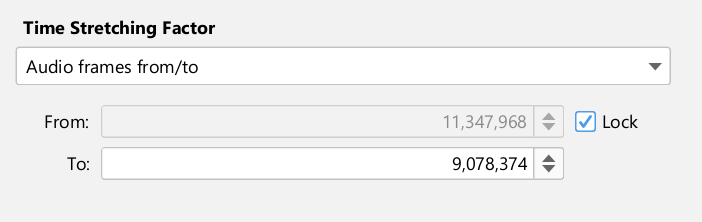 For example, a typical NTSC to PAL conversion plays a video track originally at 23.976* FPS (NTSC) on a 25 FPS system (PAL). In that case, to stretch the audio accordingly, enter 23.976 in the "From:" field, and 25 in the "To:" field.