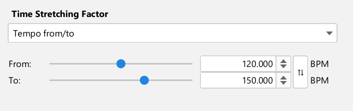 For example, specifying "120" in the "From:" field and "180" in the "To:" field will make the audio file 50% faster (like a change from 120 BPM to 180 BPM).