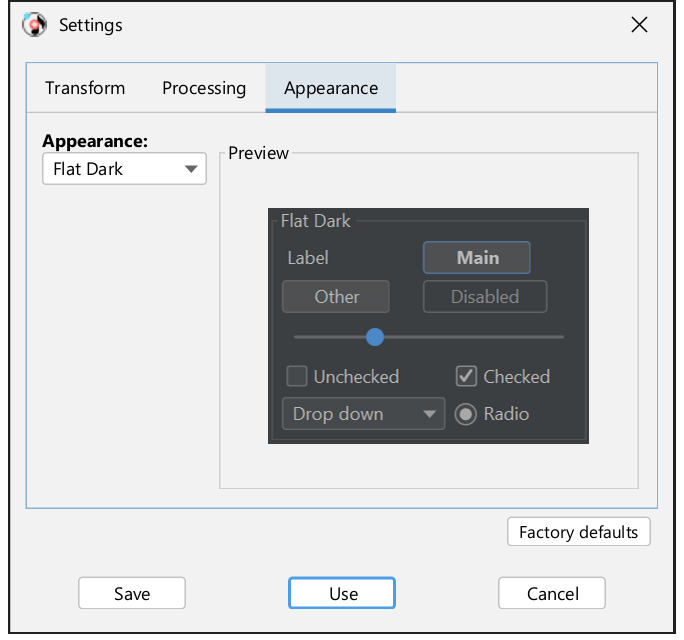 Here you can change the appearance (or skin, theme) of the application. Choose the theme from the "Appearance" drop-down. A preview is displayed on the right.