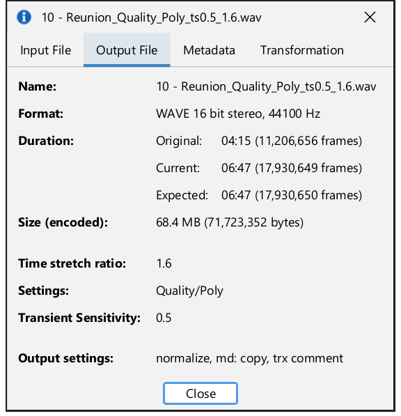 Multiple input audio files can also be specified by passing an .m3u8 playlist file. In its simplest form, an .m3u8 playlist is just a file containing a list of file paths (absolute or relative to the playlist file), one per line, with UTF-8 encoding for special characters. In that case, the same time-stretching ratio and settings are applied to all files of the playlist.