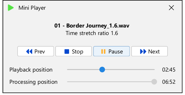 The Mini Player on the other hand can play an output file as soon as its transformation has started, even if it has not finished yet. It will play as much audio as has been already transformed.
