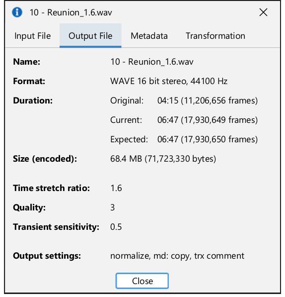 When quality 1 or 2 is used, the duration of the output file might drift from a few sample frames once fully transformed. Use quality 3 or 4 to make sure the duration of the transformed file is sample-accurate.
