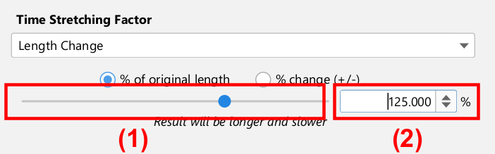 Note that within the application, the slider (see (1) in the figure below) only allows you to choose from 2 times slower to 2 times faster (which is the recommended range). You must type a value directly in the number field (2) next to the slider to choose a higher ratio up to the maximum. Transforming more than 2 times slower or faster might result in lower quality.
