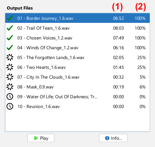 : the transformation is finished, and the file is being saved to the disk. This stage is generally quick. However, if you have a slow hard disk, the saving progress (in percent) is visible in the last column (2).
