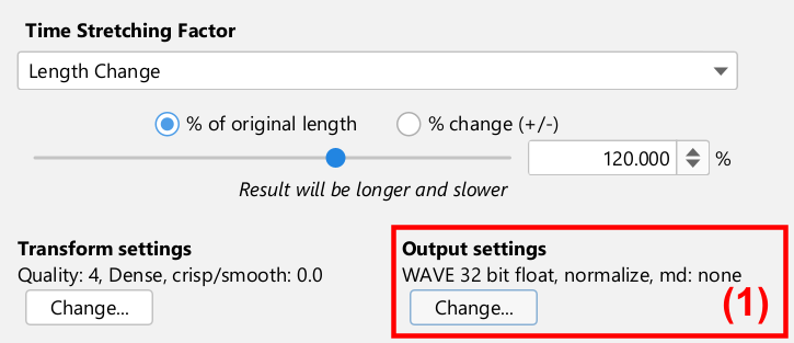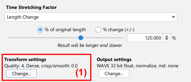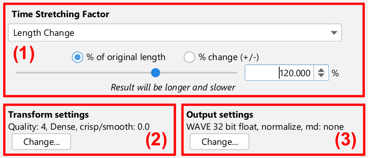 The next sections discuss the three parts in more details: Time Stretching Factor, Transform Settings and Output Settings.