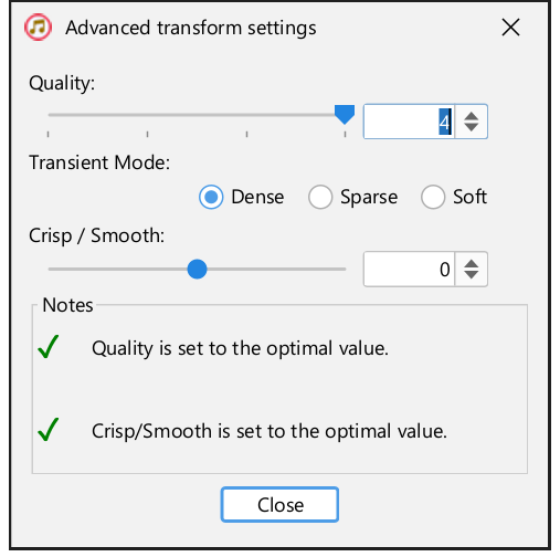 Add transformation details to Comment: when enabled, a summary of the transformation settings is appended to the "Comment" metadata of the transformed file. A typical example of summary could be "Time-Stretched by 1.2 using Tachyon (Quality 3, Transient Mode Dense, Crisp/Smooth 0.0)". If this option is enabled and the previous one is disabled, the only metadata that is added to the transformed file is the "Comment", with only the summary of the transformation settings.
