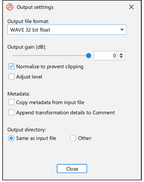 Copy metadata from the input file: whether to copy metadata from the input file to the transformed file. The following metadata are supported: Title, Artist, Album, Year, Genre, Composer, Album Artist, Track, Copyright, Comment. Other metadata won't be copied.